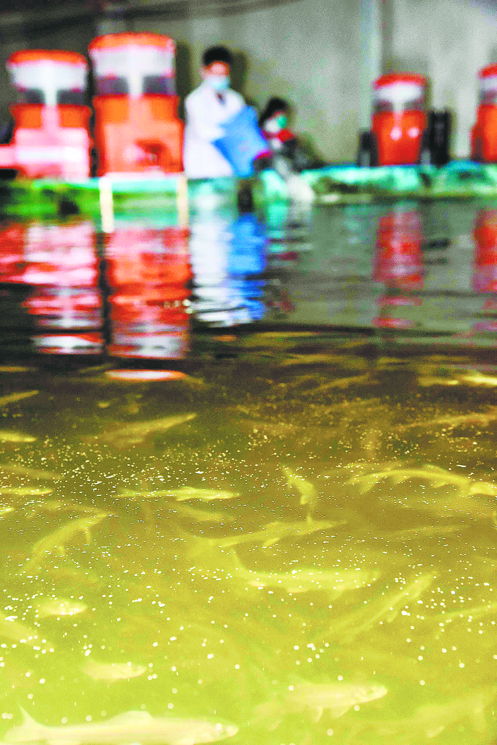 技術人員對循環(huán)水養(yǎng)殖池育苗投喂。