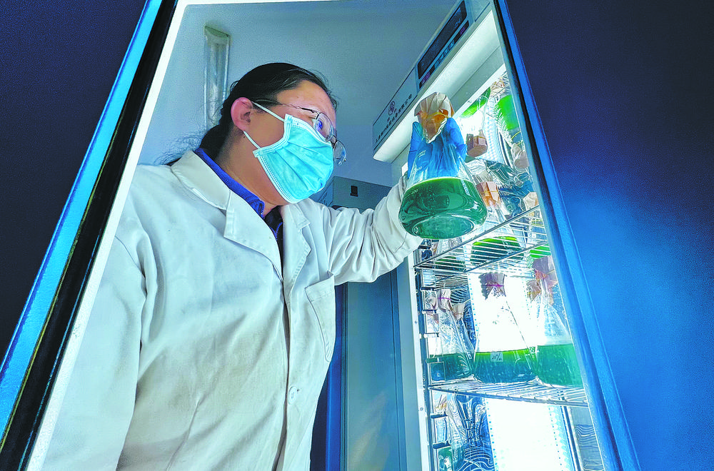 技術人員正在觀察小球藻生長情況。