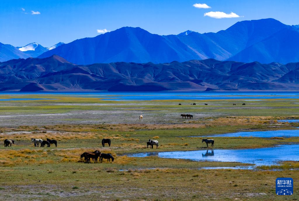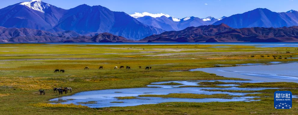 鳥瞰班公湖畔的濕地(無人機(jī)照片,9月21日攝)。新華社記者 姜帆 攝