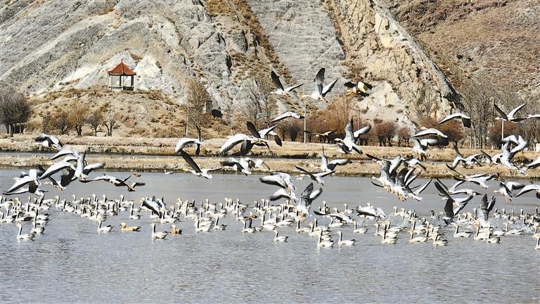 近年來,西藏不斷加強野生動物保護力度,全面提升自然保護區(qū)基礎(chǔ)設(shè)施、管理水平,健全完善野生動物保護法律法規(guī),野生動物保護工作取得顯著成效。隨著各族干部群眾保護意識不斷增強,斑頭雁、赤麻鴨、紅嘴鷗等大量保護動物都會飛到西藏過冬,它們聚集在西藏的各個湖畔,時而凌空盤旋、時而悠閑踱步,鳥鳴聲此起彼伏,構(gòu)成了冬日里一道美麗的風(fēng)景。