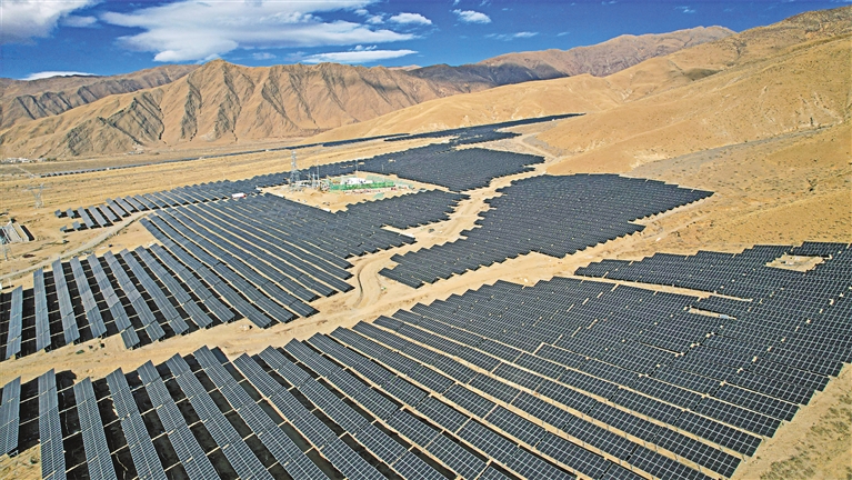 圖為瓊結縣白那村50兆瓦光伏儲能項目(無人機拍攝)。記者 旦增蘭澤 通訊員 倫珠澤仁 攝