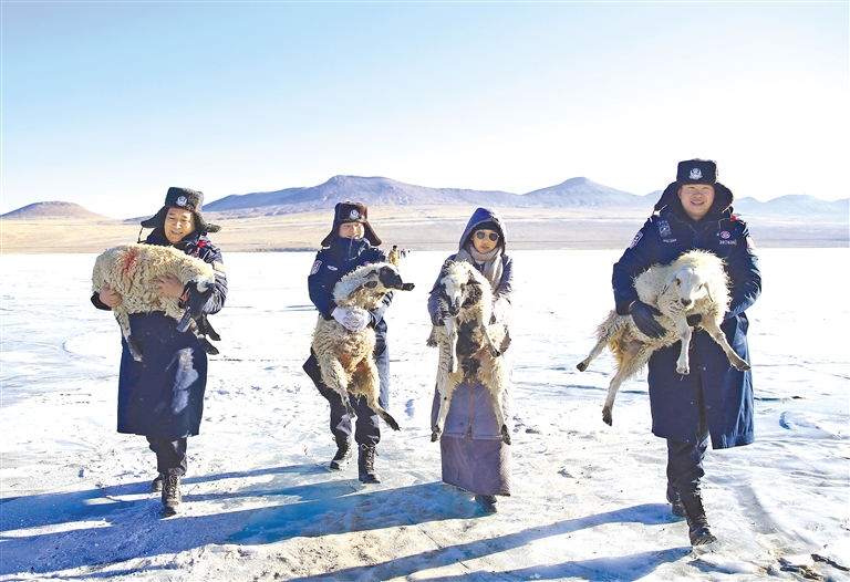 西藏出入境邊防檢查總站浪卡子邊境管理大隊民警幫助牧民將掉隊的綿羊抱往普莫雍錯的湖心島。記者 王杰學 通訊員 彭維熙 攝