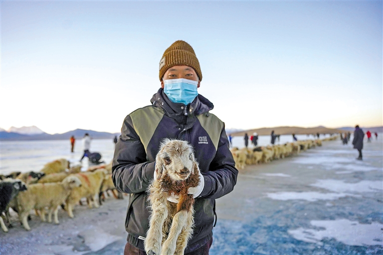 海拔5000米、3公里冰道,上千只羊,在牧羊人的護送下,從普莫雍錯北岸涉冰踏雪,輾轉(zhuǎn)到湖心島過冬。這一沿襲千年的獨特牧業(yè)生產(chǎn)方式,是推瓦村人與大自然的默契,閃爍著古老的生存智慧。