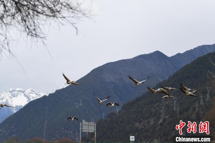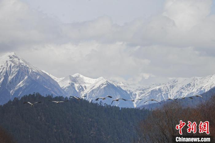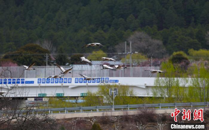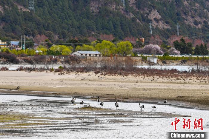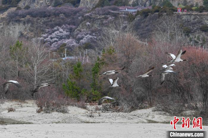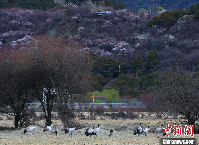 西藏林芝:黑頸鶴與雪山桃花共繪生態(tài)畫卷