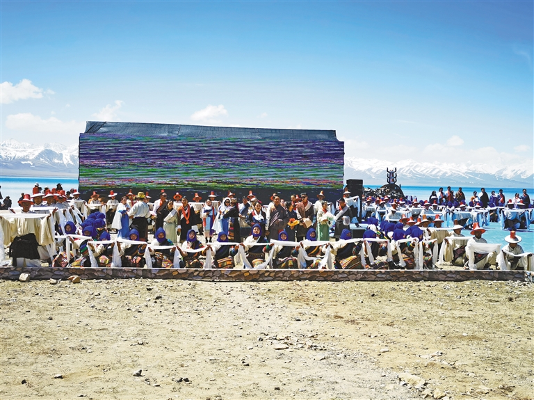 由300名演員將象征平安、吉祥的馬、牦牛、牛角、五彩哈達等元素融入表演全過程,藝術(shù)地展現(xiàn)獨有的開湖祈福場景。