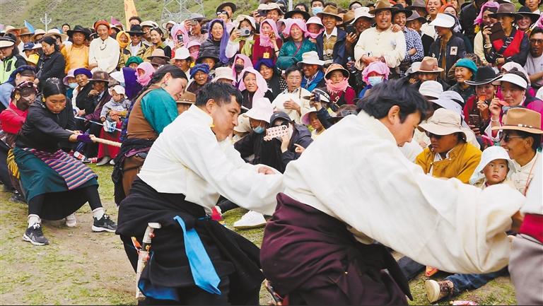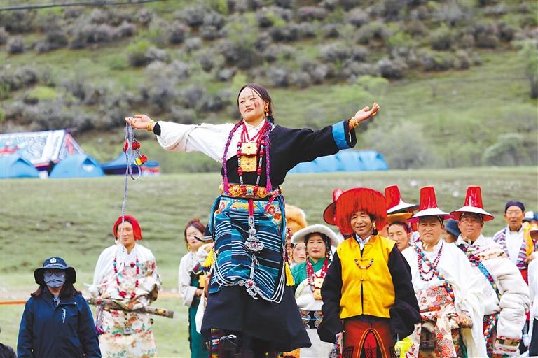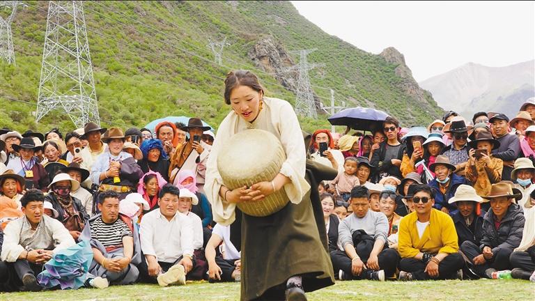 開幕式在藏雄村幼兒園小朋友表演的舞蹈《第一支花》中拉開序幕,唐古鄉(xiāng)、阿朗鄉(xiāng)、旁多鄉(xiāng)對北部三鄉(xiāng)獨(dú)特的文化藝術(shù)、生態(tài)環(huán)境以及豐富的“非遺”文化進(jìn)行展示與推介,還有特色服飾展演,他們將秀場搬到大自然,以“傳統(tǒng)民族服飾走秀+‘非遺’文化展示+牧區(qū)生活用具展示”為核心,配以林周縣唐古鄉(xiāng)關(guān)于北部三鄉(xiāng)服飾的唱頌詞與鼓點(diǎn)相融合,為展演提供了獨(dú)特的音樂伴奏,展現(xiàn)了林周縣北部三鄉(xiāng)豐富的民族文化。