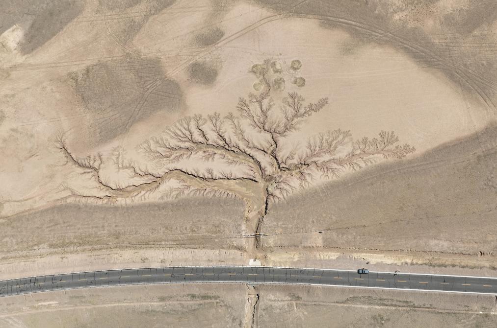 這是在甜水河畔荒灘雪地中向產(chǎn)羔地遷徙的藏羚羊(6月15日攝 無人機(jī)照片)。新華社記者 晉美多吉 攝