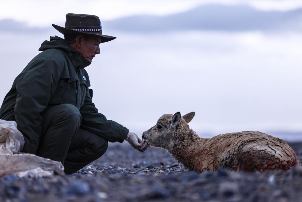 羅布嫻熟地用酒精清潔創(chuàng)面,手持針線慢慢地縫合她的肚皮——這場手術(shù)進(jìn)行了50分鐘,母藏羚羊漸漸可以動了,她用鼻尖蹭了一下羅布的手,掙扎著起身,緩緩?fù)鶘|走去——那里是產(chǎn)羔地。