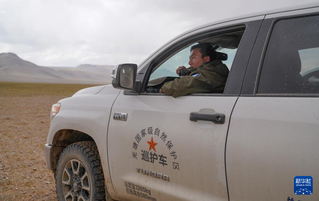 6月15日,羌塘國(guó)家級(jí)自然保護(hù)區(qū)野生動(dòng)物專(zhuān)業(yè)管護(hù)隊(duì)員羅布通過(guò)對(duì)講機(jī)聯(lián)系巡邏路上的隊(duì)員。新華社記者 晉美多吉 攝