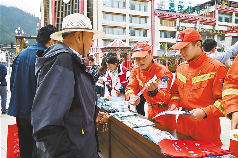 活動現(xiàn)場,波密縣森林消防中隊(duì)消防員通過發(fā)放防災(zāi)減災(zāi)宣傳資料、講解安全生產(chǎn)常識的形式,向過往群眾宣傳普及森林火災(zāi)、洪澇、山體滑坡、地震等自然災(zāi)害以及逃生自救、互救知識和技能。