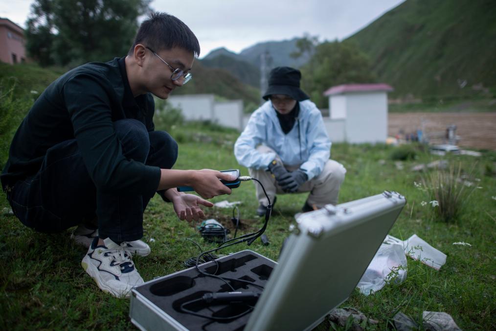 7月20日,在直門達水文站,長江科學院空間信息技術應用研究所廖茂昕(左)和付珺琳進行土壤多參數(shù)檢測。新華社記者 伍志尊 攝
