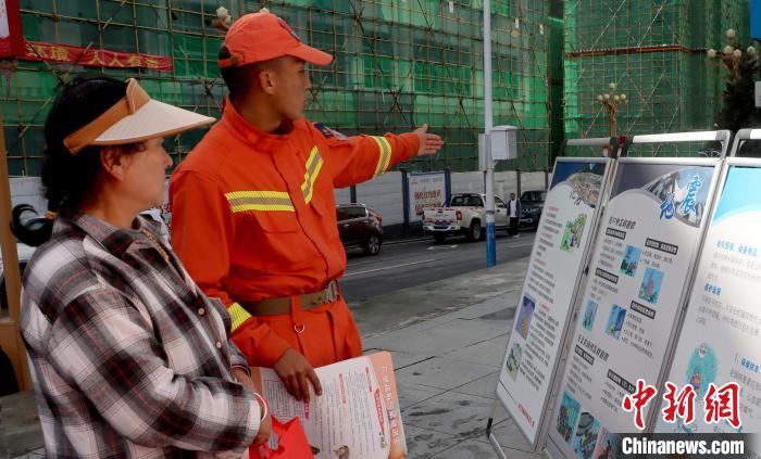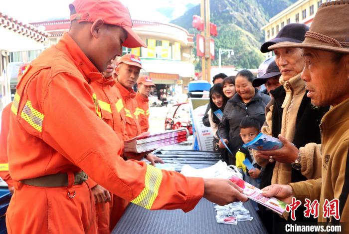圖為消防救援人員發(fā)放宣傳手冊(cè)。費(fèi)賢浩 攝