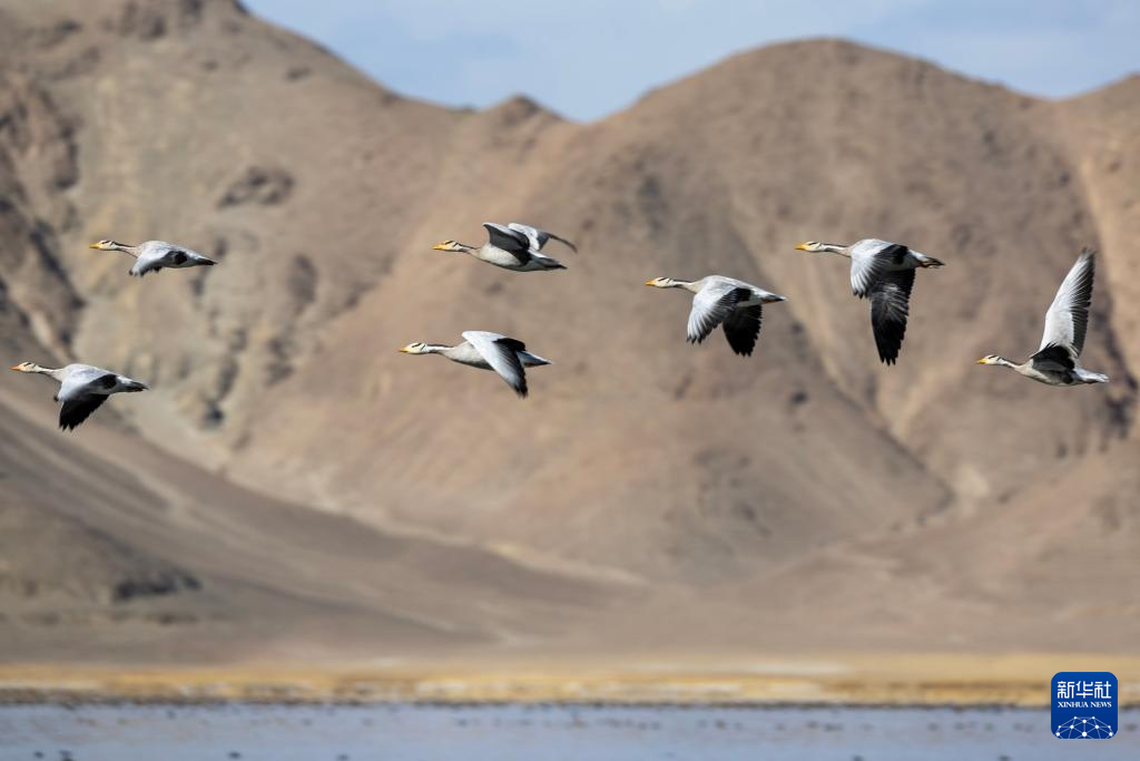 斑頭雁在班公湖上空飛翔(11月16日攝)。新華社記者 姜帆 攝