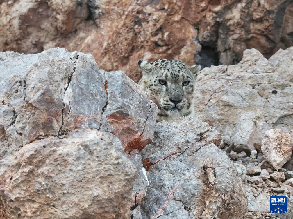 西藏阿里改則縣改則鎮(zhèn)玉多村附近巖山區(qū)域拍攝到的國家一級保護(hù)動物雪豹(4月18日攝)。新華社發(fā)(索朗仁青 攝)