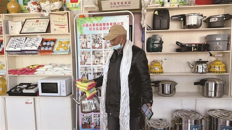 當(dāng)時(shí),該超市還有其他群眾在兌換物品?!袄旁谶@里變成了值錢的東西,真正實(shí)現(xiàn)了變廢為寶!”德慶鎮(zhèn)村民旺姆捧著手機(jī),滿臉笑意地向記者展示積分頁(yè)面里面她的5386積分,她正盤算著兌換5套規(guī)格不同的鋁鍋和一套甜茶餐具?!爸坝梅e分換過(guò)大米、洗衣液、洗潔精、油等物品,這次想換些實(shí)用的大件?!蓖氛f(shuō),最讓她滿意的是兌換的奶粉,“省下了制作甜茶時(shí),買奶粉的錢,這積分兌換真是辦到了我們心坎里。”