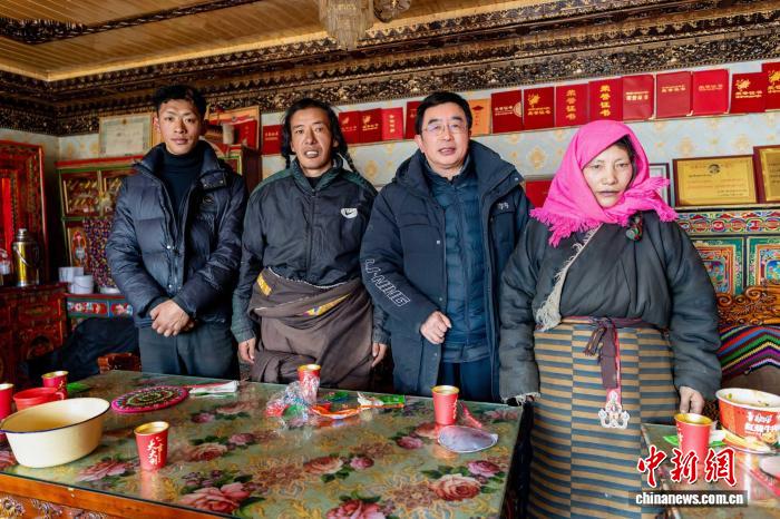 2025年12月21日,連玉明(右二)走進海拔5300米的長江源頭牧民家中調(diào)研,并與牧民一家合影。受訪者供圖