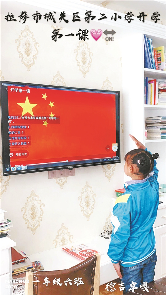 整潔的書桌上擺放著嶄新的教材,穿上干凈的校服、系好鮮艷的紅領巾,西藏拉薩市城關(guān)區(qū)第二小學的學生鄭重地舉起右手向電視屏幕里的國旗敬禮。隨后,教師在線上為學生進行授課,而孩子們也在家里開啟了新的上課模式,聽課、記筆記、寫作業(yè)、背書……