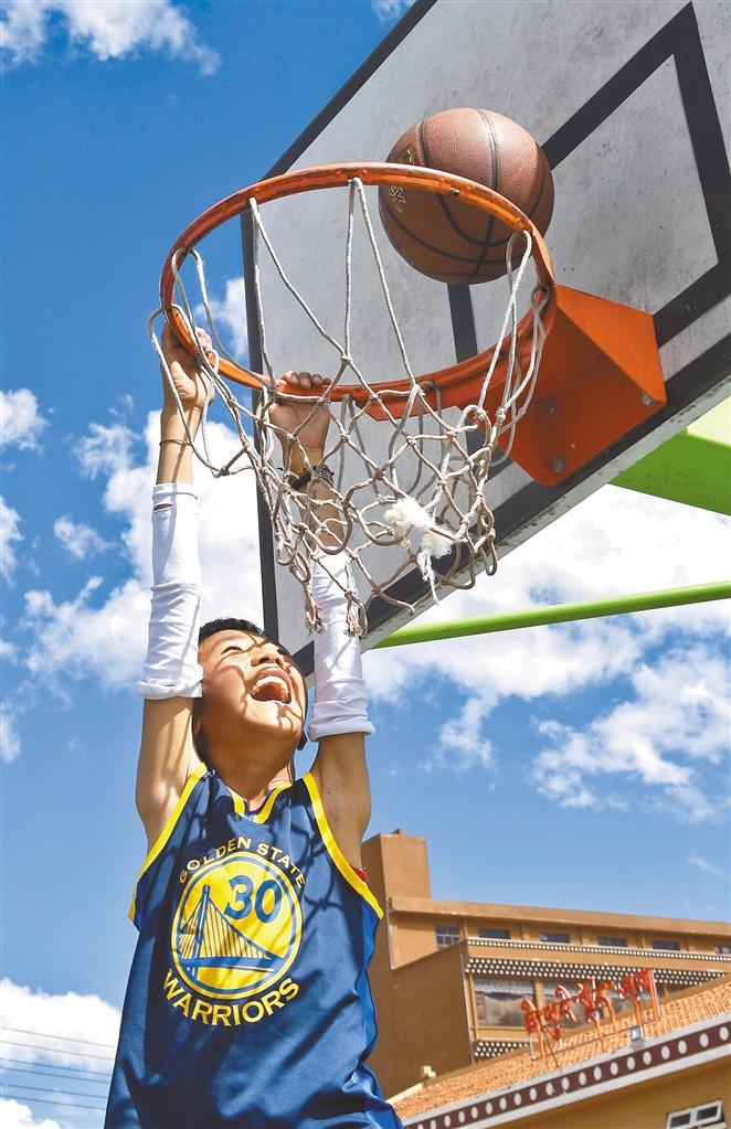 圖為四川省阿壩藏族羌族自治州阿壩縣民族寄宿制小學的學生在體育課上練習扣籃(6月14日攝)。新華社記者 劉坤 攝