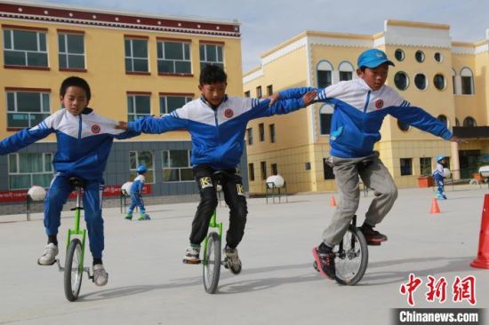 圖為鄉(xiāng)村學(xué)校少年宮的孩子們正在騎獨(dú)輪車?!〔抛尡?攝