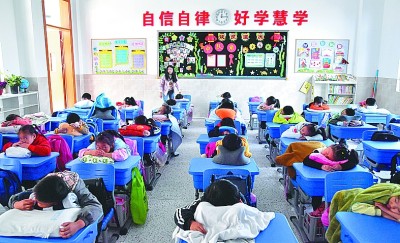 圖為10月21日,淮安山陽湖小學(xué),中午沒回家的學(xué)生在教室午睡。丁幼華攝