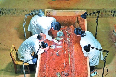 考古工作人員對江西南昌西漢海昏侯墓園五號墓的內(nèi)棺進(jìn)行清理。新華社發(fā)