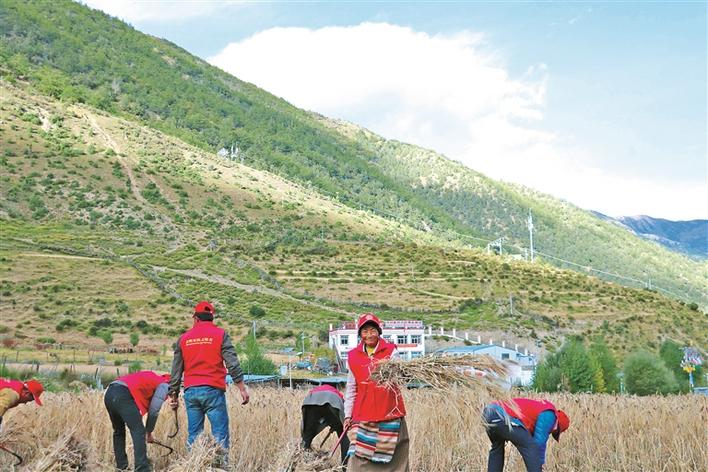圖為朗縣拉多鄉(xiāng)新時(shí)代文明實(shí)踐巾幗志愿服務(wù)隊(duì)的隊(duì)員們正在幫助村民收割青稞。胡照躍 攝
