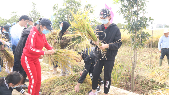 在雜交水稻實(shí)驗(yàn)田,同學(xué)們穿著膠鞋,戴著手套,手持鐮刀,雙手緊握稻稈賣力地打谷,全然不顧額頭上的汗水。還有同學(xué)穿梭在田間,將割下的新稻搬到打谷場(chǎng),將打完的稻稈抱到馬路邊。