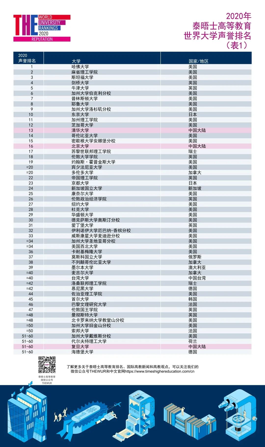 泰晤士高等教育發(fā)布2020年大學(xué)聲譽(yù)排名,清北位列世界前20