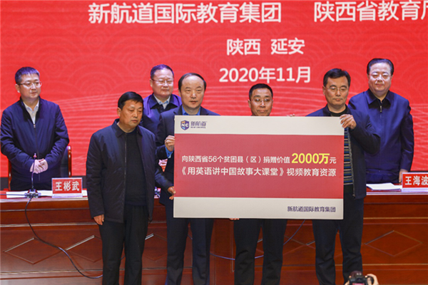 2020年是脫貧攻堅(jiān)的決戰(zhàn)決勝之年。繼陜西省56個(gè)貧困縣(區(qū))全部實(shí)現(xiàn)“脫貧摘帽”之后,又收到一份教育大禮——由新航道國際教育集團(tuán)捐贈(zèng)的價(jià)值2000萬元的《用英語講中國故事》視頻課程。當(dāng)天,陜西省教育廳副廳長王海波與新航道國際教育集團(tuán)董事長兼CEO胡敏共同出席在宜川中學(xué)舉行的捐贈(zèng)儀式,開啟新航道國際教育集團(tuán)助力陜西教育扶貧的新篇章。