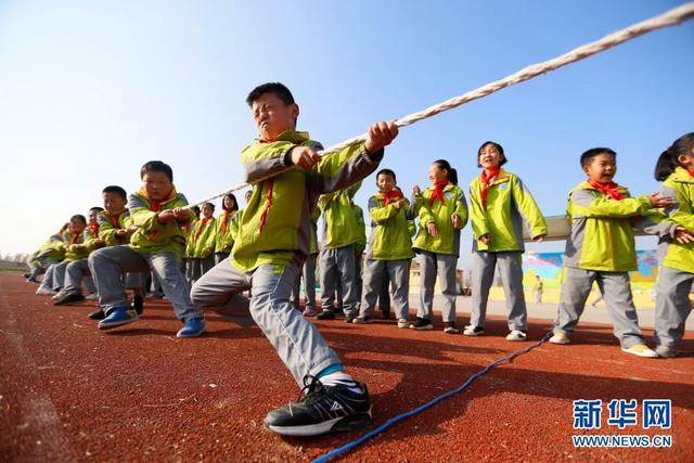 11月12日,學(xué)生在大課間參加拔河比賽。 位于山東省青島市即墨區(qū)的青島藍(lán)谷高新區(qū)東皋埠小學(xué)是一所鄉(xiāng)村學(xué)校,近年來,學(xué)校開展以乒乓球、籃球、跳繩等運(yùn)動(dòng)為主的大課間活動(dòng),讓孩子們?cè)谙硎苓\(yùn)動(dòng)的同時(shí)愉悅身心,增強(qiáng)體質(zhì)。 新華社發(fā)(梁孝鵬攝)