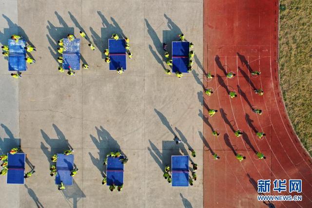 11月12日,學(xué)生在大課間打乒乓球(無人機(jī)照片)。 位于山東省青島市即墨區(qū)的青島藍(lán)谷高新區(qū)東皋埠小學(xué)是一所鄉(xiāng)村學(xué)校,近年來,學(xué)校開展以乒乓球、籃球、跳繩等運(yùn)動(dòng)為主的大課間活動(dòng),讓孩子們?cè)谙硎苓\(yùn)動(dòng)的同時(shí)愉悅身心,增強(qiáng)體質(zhì)。 新華社發(fā)(梁孝鵬攝)