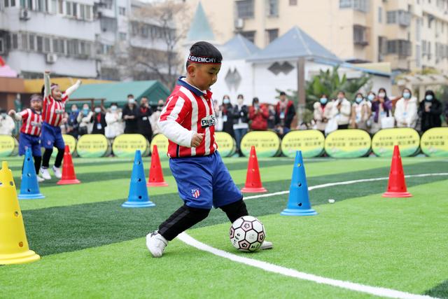 12月7日,淮北市第二實驗幼兒園的小朋友在足球課上參加足球游戲。
