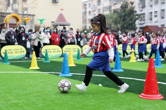 12月7日,淮北市第二實驗幼兒園的小朋友在足球課上學習踢足球。