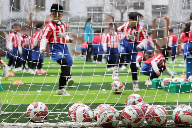 12月7日,淮北市第二實驗幼兒園的小朋友在足球課上學習踢足球。安徽省淮北市第二實驗幼兒園是一所“全國足球特色幼兒園”。該園把足球列入幼兒園體育課教學內(nèi)容,通過開設幼兒足球趣味練習、足球游戲等特色課程,向孩子們傳授足球基本知識和技巧,從小培養(yǎng)孩子們對足球的興趣,讓他們感受足球運動的魅力,健康快樂成長。新華社發(fā)(萬善朝 攝)