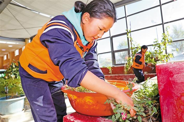 日喀則市上海實驗學校的學生在種植專業(yè)課上學習種植花卉。