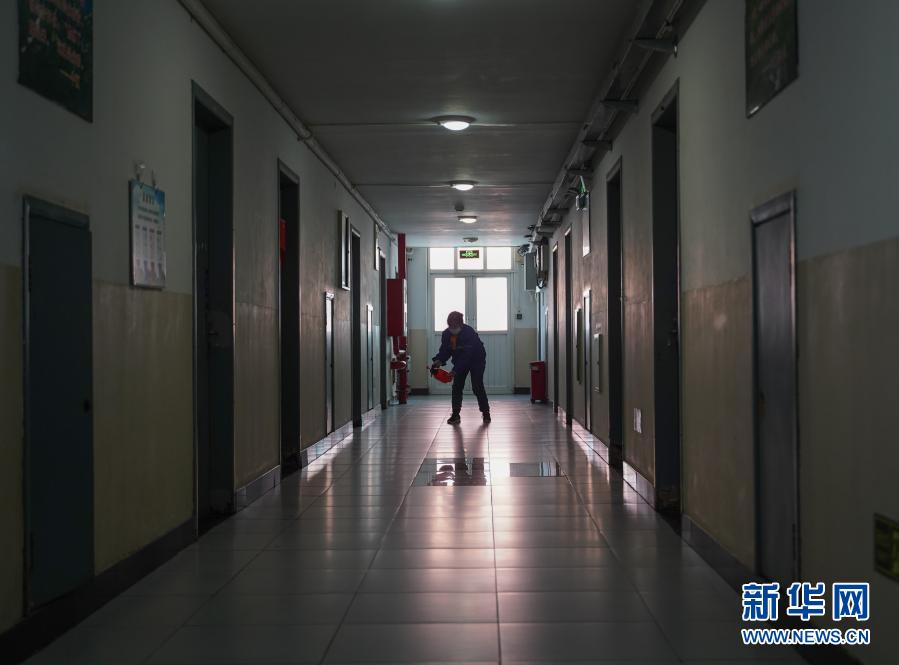2月8日,工作人員在北京交通大學(xué)22號公寓樓道內(nèi)進(jìn)行消殺。新華社記者 張浩波 攝
