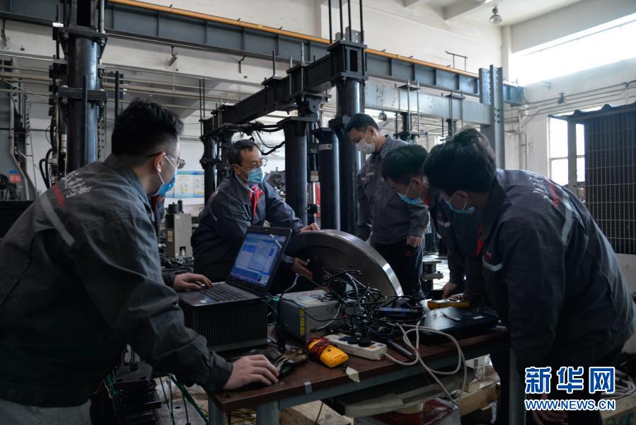 2月9日,北京交通大學(xué)教師和學(xué)生在結(jié)構(gòu)強(qiáng)度檢測實(shí)驗(yàn)室一起研討高速列車輪軸結(jié)構(gòu)可靠性。新華社記者 徐欽 攝