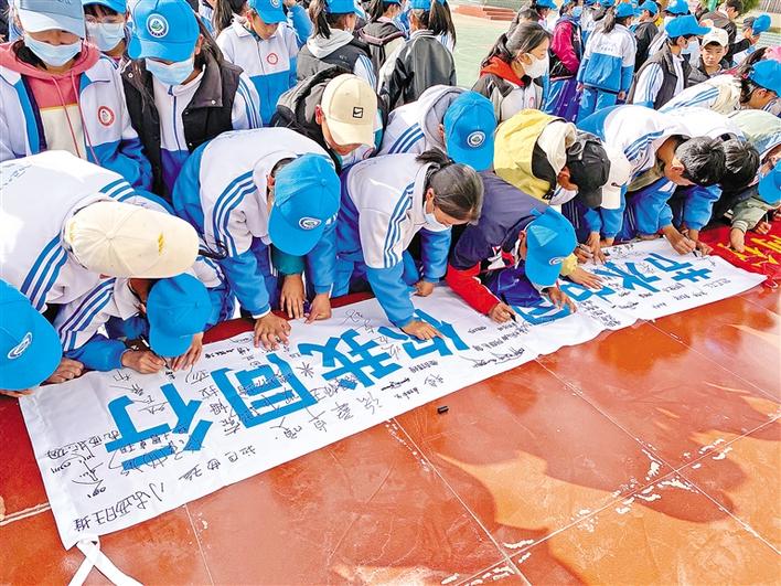 圖為學生們在條幅上簽名,許下節(jié)水愛水的承諾。錢加典 王珊 攝