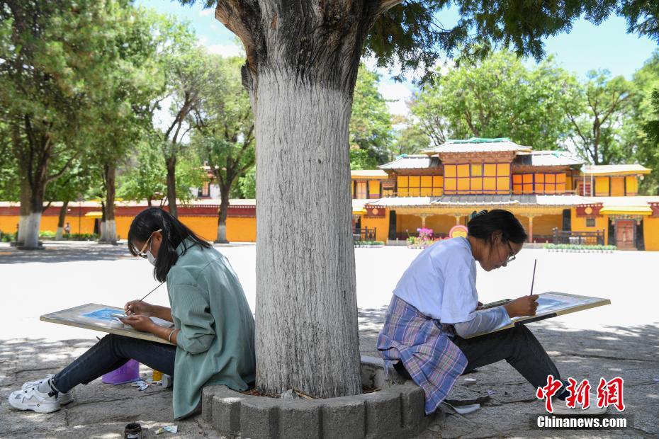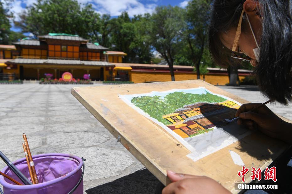 7月8日,西藏大學建筑系學生前往西藏自治區(qū)拉薩市城關區(qū)羅布林卡進行建筑美術實習。在7天的實習中,學生們將在哲蚌寺、色拉寺等地,把西藏民族特色建筑、風景一幅幅手繪在紙上。圖為西藏大學建筑系學生手繪羅布林卡風景。 中新社記者 貢嘎來松 攝