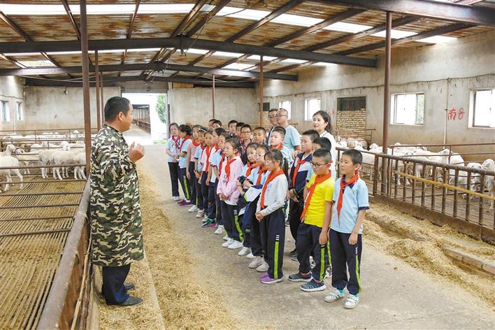 9月2日,肉羊養(yǎng)殖場(chǎng)的技術(shù)人員帶領(lǐng)渭州學(xué)校的學(xué)生們參觀羊舍并進(jìn)行講解。新華社發(fā)