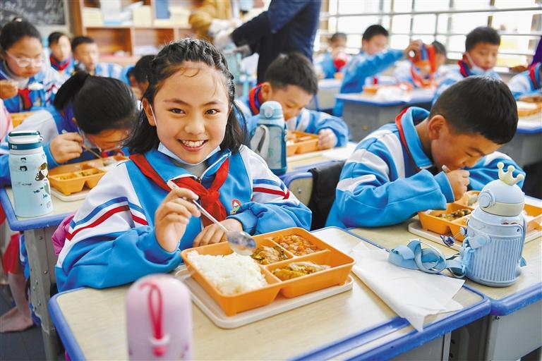圖為拉薩市實(shí)驗(yàn)小學(xué)東城分校小學(xué)生在享用營養(yǎng)午餐(5月12日攝)。新華社記者 張汝鋒 攝