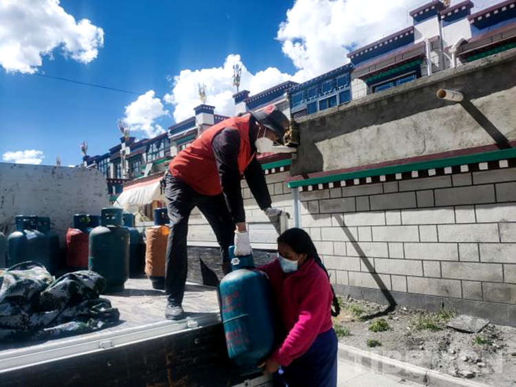 志愿服務(wù)隊(duì)志愿者們通過電話、微信群等方式排查,詢問并收集群眾基本生活物資(面粉、大米、煤氣罐加氣、蔬菜)需求,安排專人和車子到洛扎縣城進(jìn)行代購,并以最快的速度把物資送到群眾家門口。