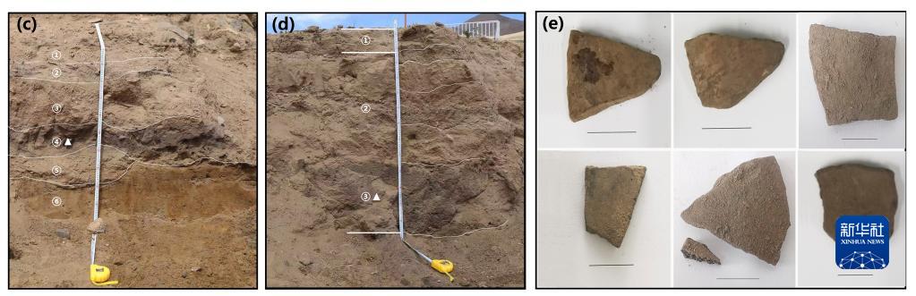 圖(c)(d)分別為共塘遺址調(diào)查剖面1和剖面2地層(三角形表示陶片位置)。圖(e)為本研究所分析的陶片照片。(資料圖片由第二次青藏科考隊(duì)“人類(lèi)活動(dòng)歷史及其影響”分隊(duì)提供)