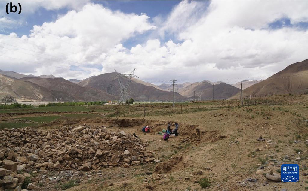 圖(b)為科考隊(duì)員發(fā)現(xiàn)共塘遺址后隨即進(jìn)行地層剖面清理和樣品采集。(資料圖片由第二次青藏科考隊(duì)“人類(lèi)活動(dòng)歷史及其影響”分隊(duì)提供)