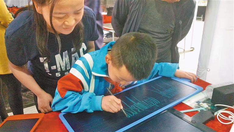 圖為小學(xué)生在次仁多吉設(shè)計(jì)的電子寫(xiě)字板上書(shū)寫(xiě)藏文字母。見(jiàn)習(xí)記者 武沛濤 攝