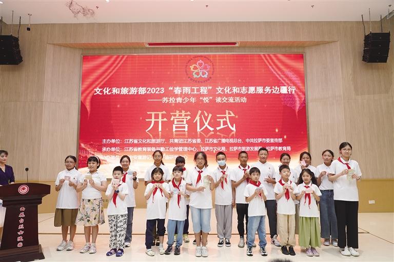 儀式上,江蘇和拉薩兩地青少年圍繞“中華民族一家親,同心共筑中國夢”主題開展了互助結對儀式和“春雨工程”授旗儀式,范躍平和陳兵共同將文旅部“春雨工程”項目旗幟授給本次活動項目領隊、拉薩市圖書館館長朱純琳。