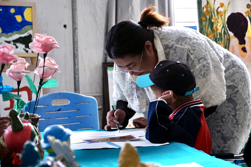 圖為培智美工教室內(nèi),在特教老師輔導(dǎo)下繪畫的學(xué)生。