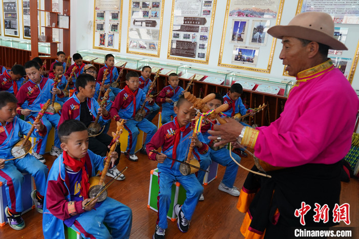 待弦子興趣班30多名學生坐下,定主如往常一樣,首先帶領(lǐng)學生們校準弦子的高低音,接著才是傳授新曲子。他要求學生不僅會拉奏樂曲旋律,還要能吟唱歌詞,“地處高高的雪山,菩提樹兒把根扎,賓客是花白牦牛,菩提樹兒長得高,牦牛呀膘肥體壯,菩提樹兒葉茂盛……”