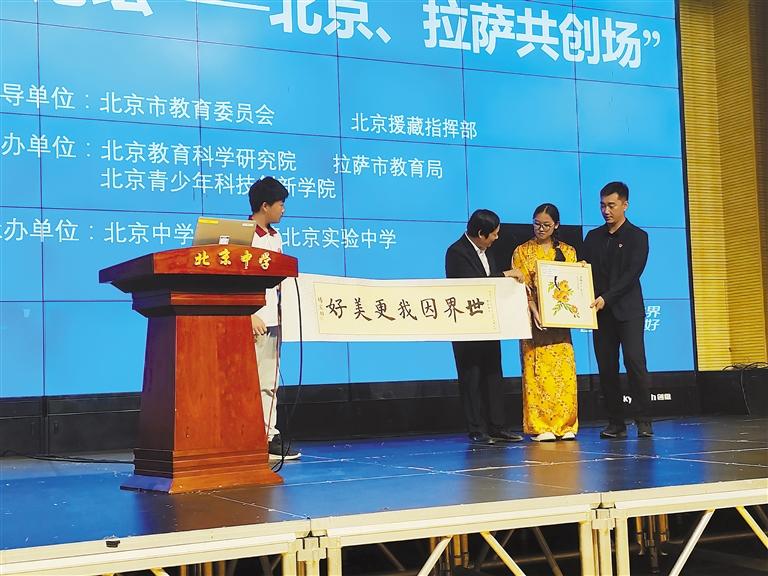 圖為拉薩北京實驗中學學生向友好學校贈送禮物。