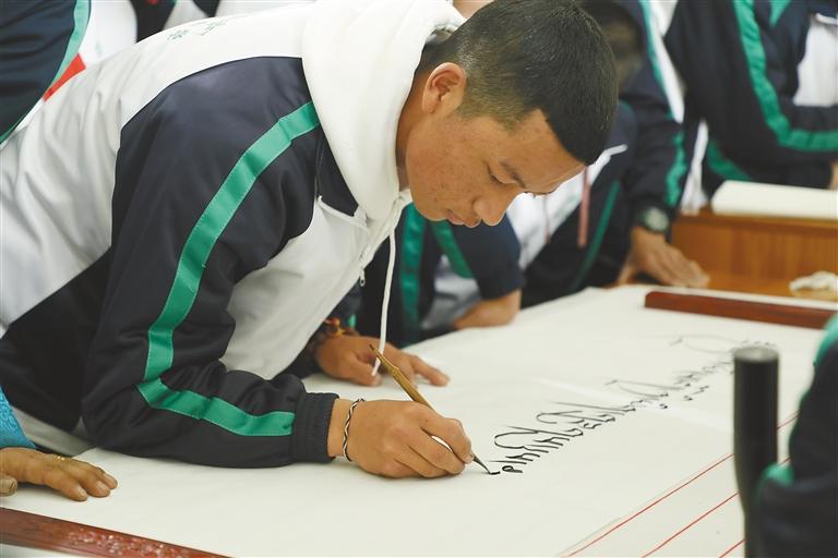 圖為學生展示竹筆藏文書法。